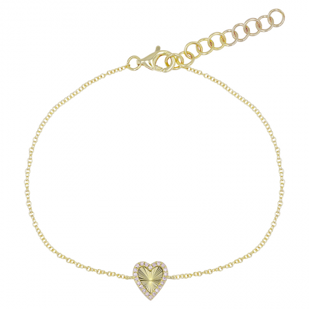 Celebrate timeless elegance with our Fluted Heart Diamond Bracelet, a romantic and beautifully detailed piece crafted to shine from every angle. At its center sits a stunning fluted gold heart, richly textured to catch the light and framed by a delicate outline of round brilliant diamonds for the perfect touch of sparkle.