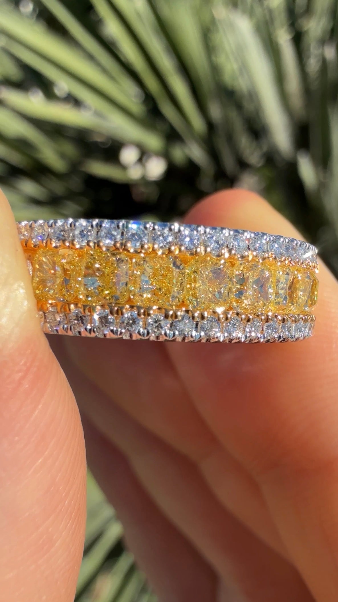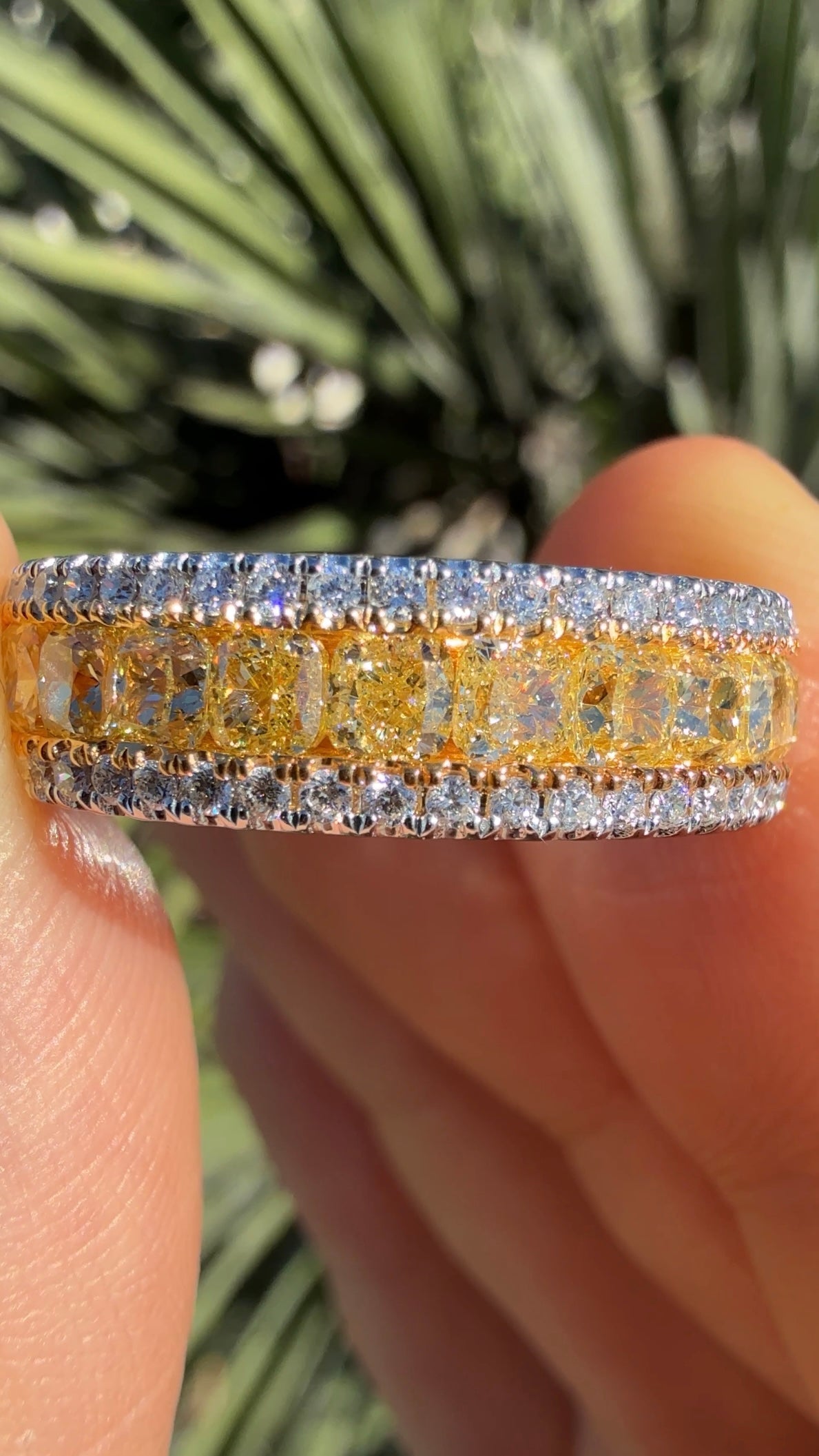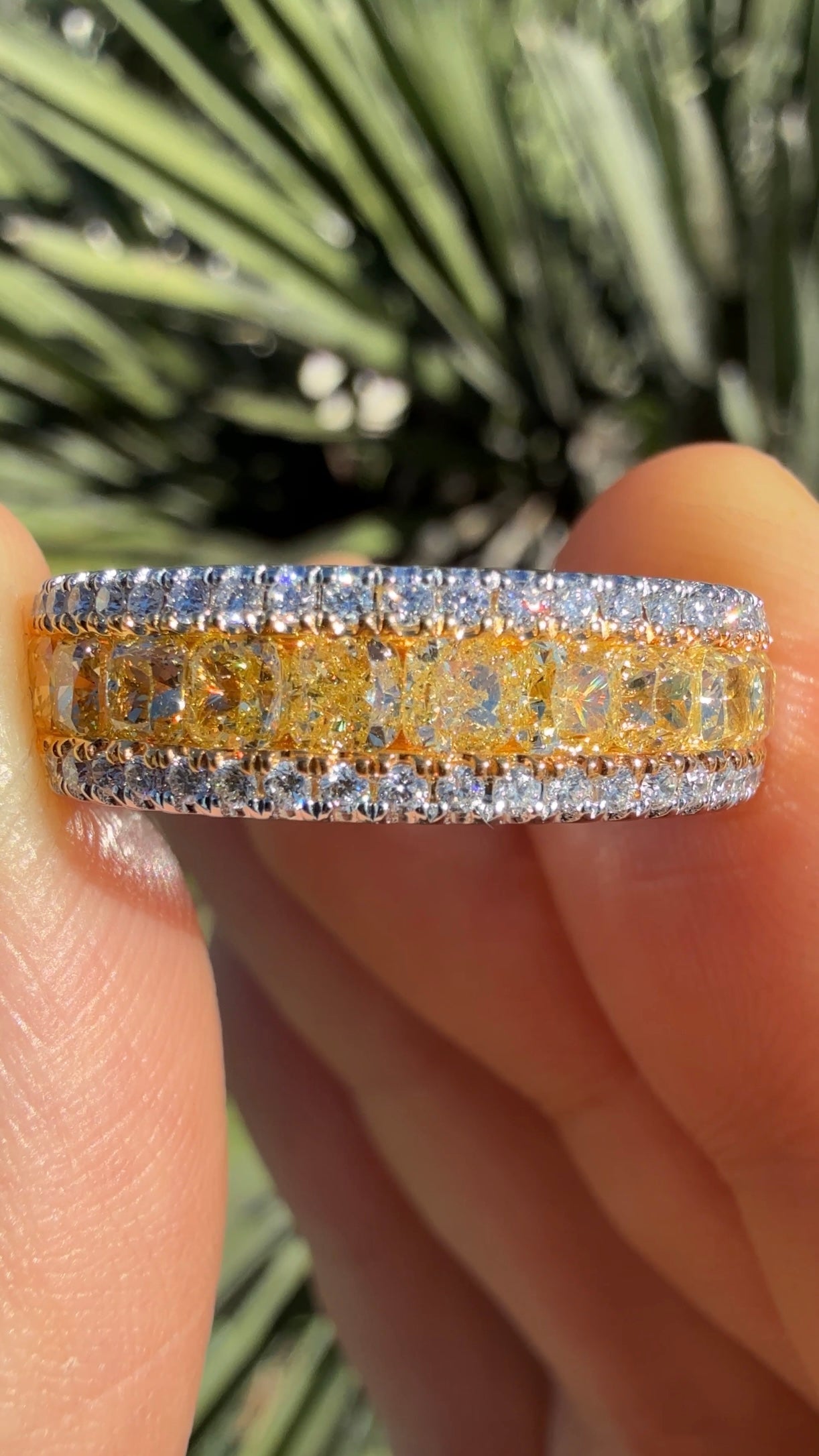 Introducing our stunning 2.25 Carat Yellow Diamond Band, a true masterpiece of elegance and craftsmanship. This exquisite band features a central row of vibrant yellow diamonds set in 18K yellow gold, beautifully flanked by two rows of smaller white diamonds set in 18K white gold. The combination of the vivid yellow and sparkling white diamonds creates a striking contrast, enhancing the brilliance of each stone. Perfectly crafted, this band is a timeless addition to any jewelry collection. Elevate your style with the radiant beauty and sophisticated charm of this exceptional piece.