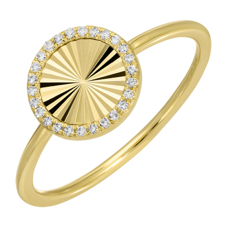 Modern texture meets timeless sparkle in the Fluted Diamond Disc Ring. This refined 14K gold band features a beautifully crafted fluted gold disc at its center, creating a stunning play of light and dimension. Surrounding the disc is a delicate halo of round brilliant diamonds, adding a radiant frame of shimmer that elevates the design with effortless sophistication.