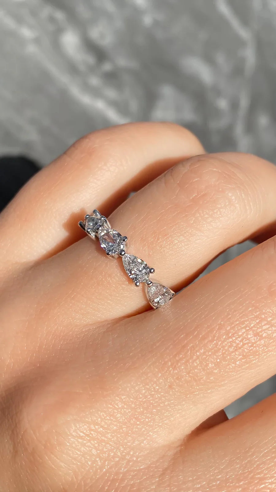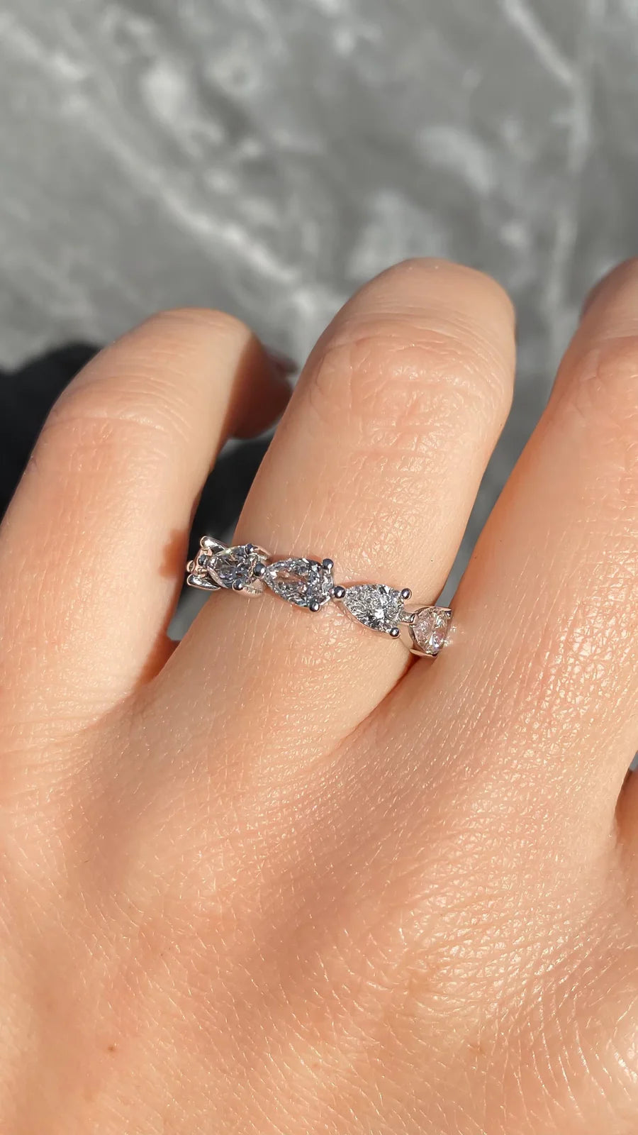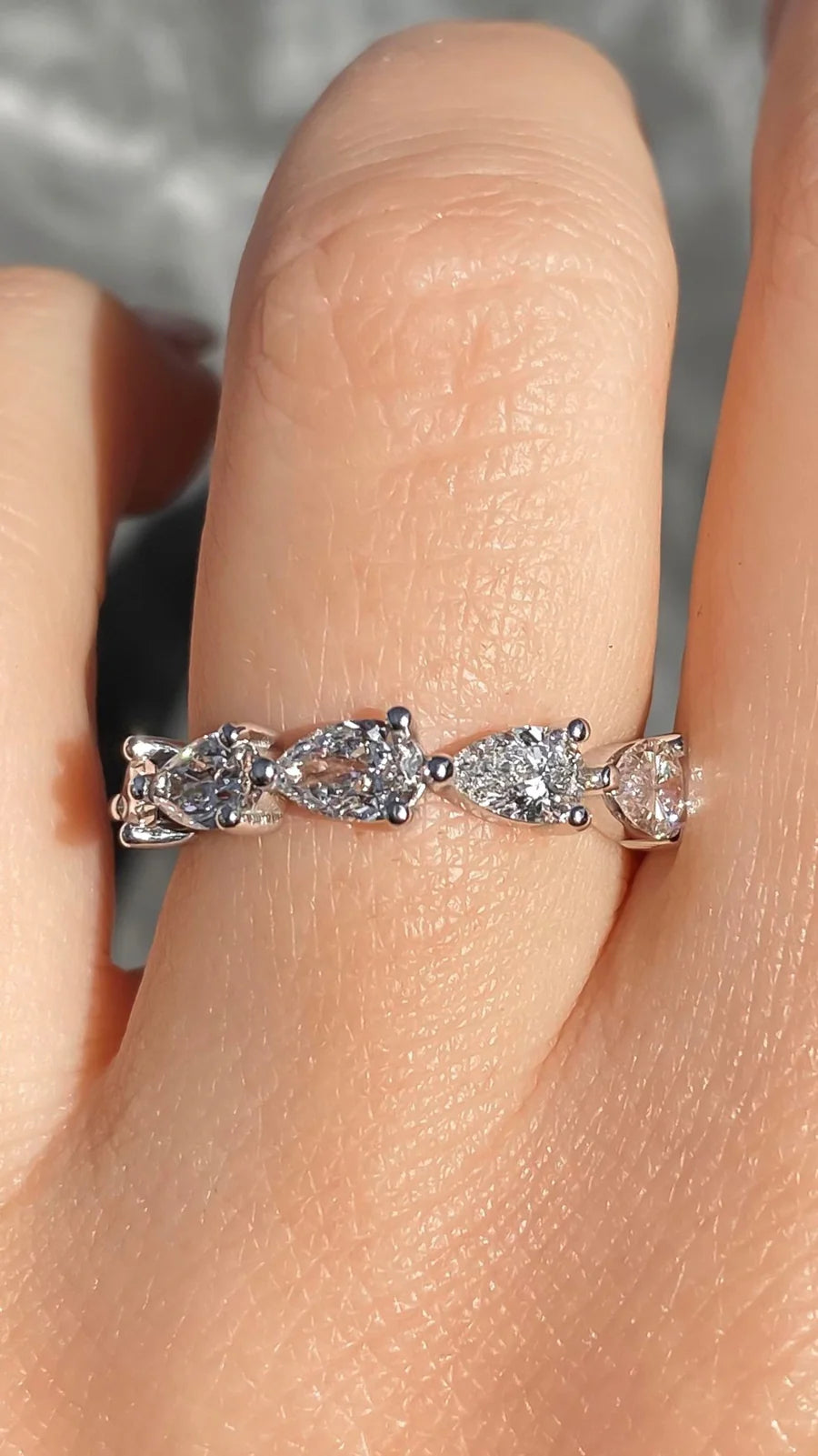 Modern elegance meets timeless sparkle in this Lab Grown Diamond East-West Pear Cut Band. Featuring beautifully faceted pear-shaped lab grown diamonds set horizontally in a sleek east-west design, this ring offers a fresh and distinctive take on the classic diamond band.