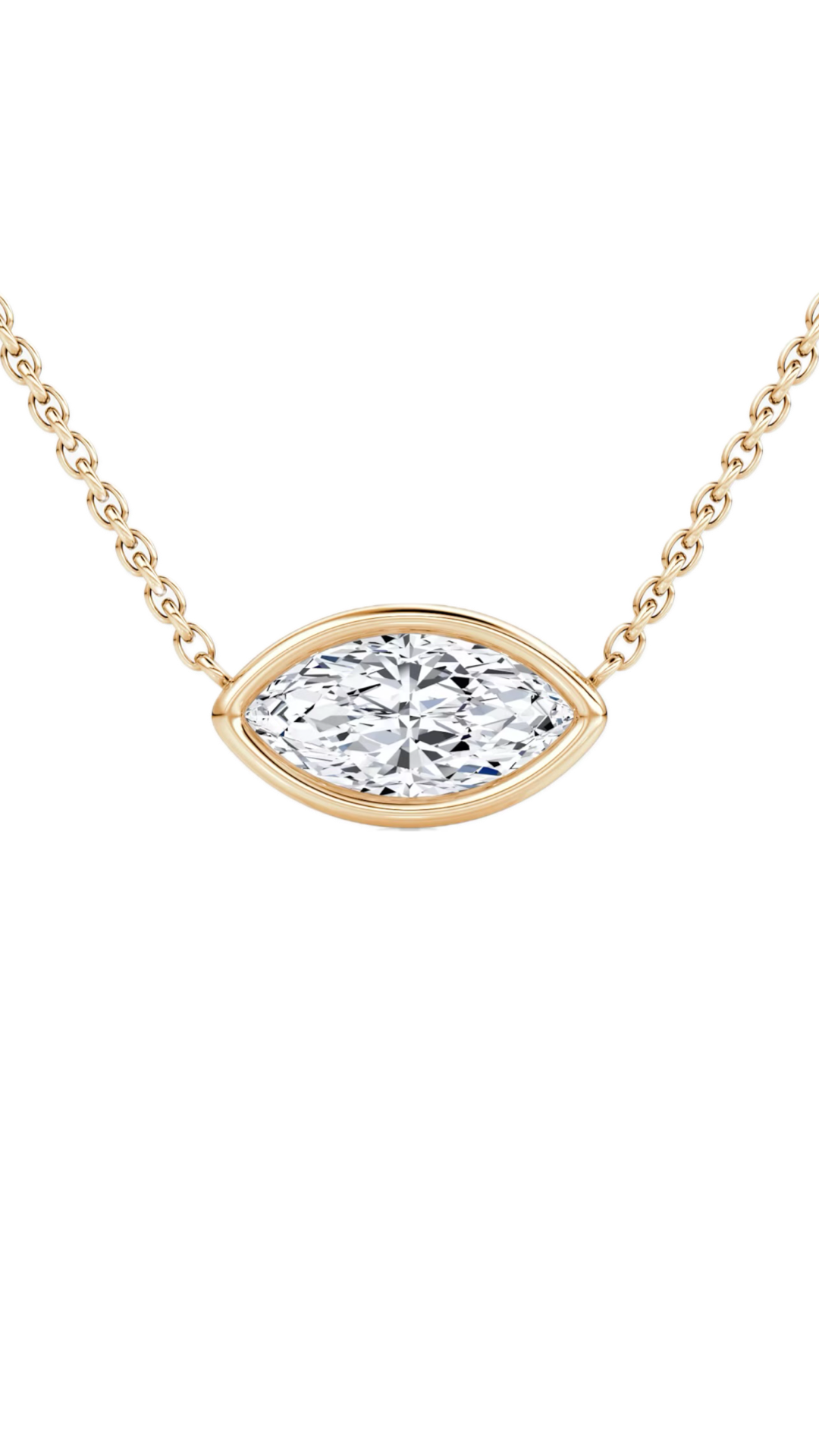 Introducing our Lab Grown Bezel Set Marquise East-West Diamond Solitaire Necklace — a modern twist on elegance. Select your preferred metal: 14K Yellow Gold or White Gold. Personalize your sparkle with a lab-grown marquise cut diamond, ranging from 1 to 3 carats. Redefine sophistication with a necklace that mirrors your style and values.