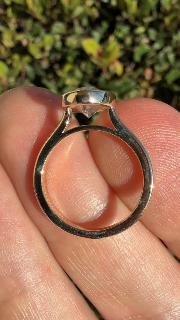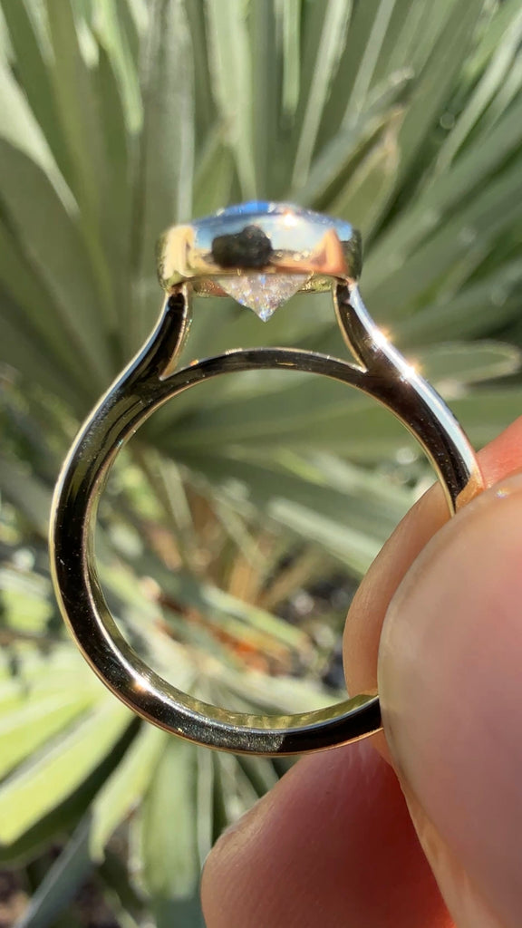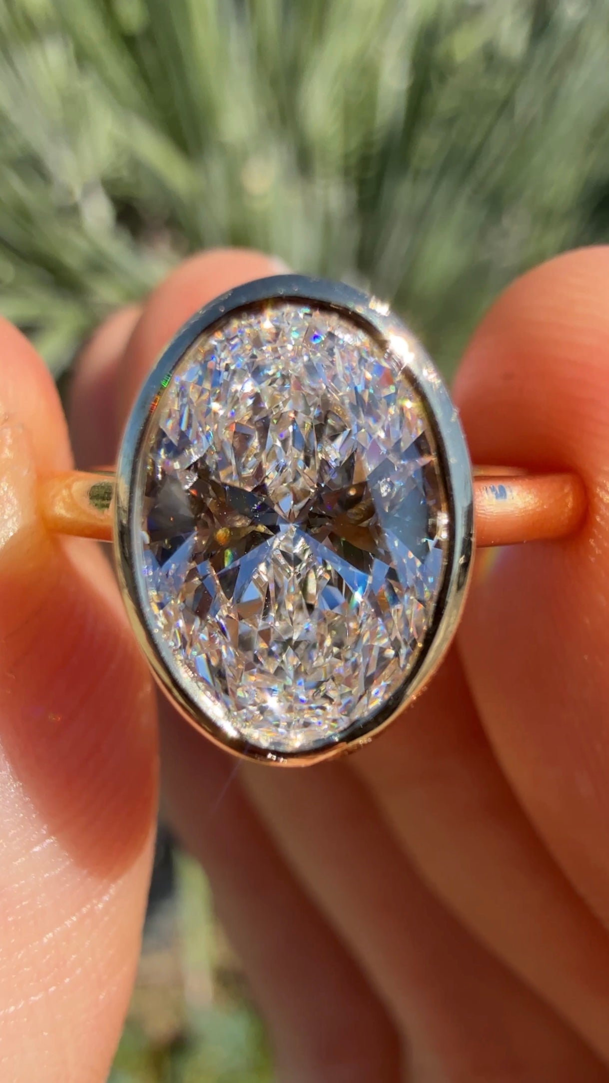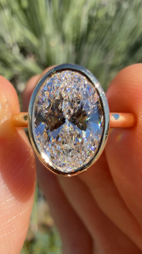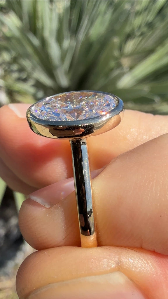 Available in your choice of 14K white or yellow gold, this engagement ring can be customized with your preferred lab grown diamond carat size, ranging from 2 to 5 carats. Designed for the modern bride, this oval solitaire engagement ring embodies sophistication, ethical craftsmanship, and everlasting beauty.